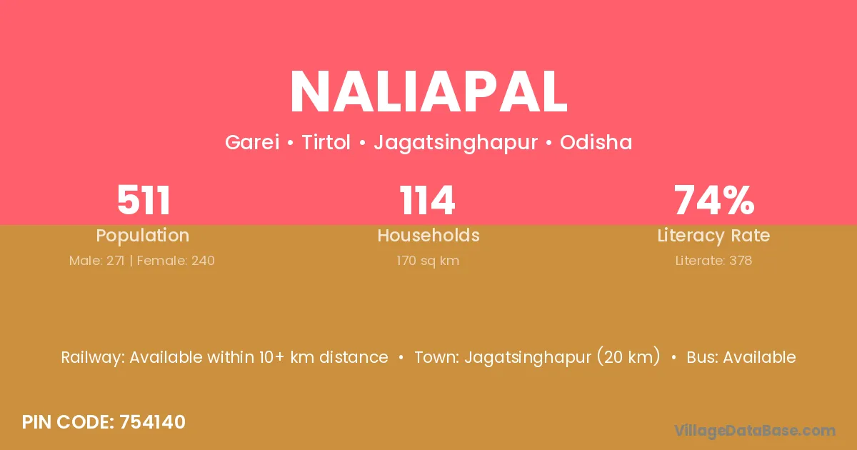 Jagatsinghapur (20 km) is the nearest town to Naliapal village for major economic activities and is located approximately 20 km away.
