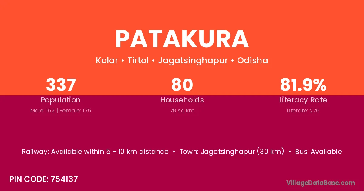 Jagatsinghapur (30 km) is the nearest town to Patakura village for major economic activities and is located approximately 30 km away.