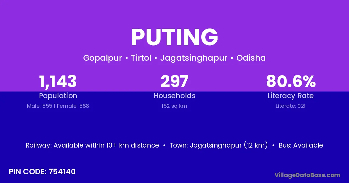 Jagatsinghapur (12 km) is the nearest town to Puting village for major economic activities and is located approximately 12 km away.