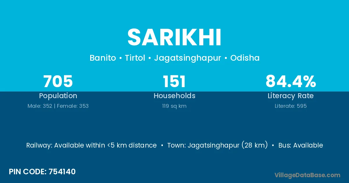 Jagatsinghapur (28 km) is the nearest town to Sarikhi village for major economic activities and is located approximately 28 km away.