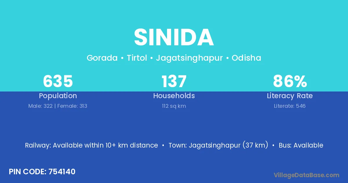 Jagatsinghapur (37 km) is the nearest town to Sinida village for major economic activities and is located approximately 37 km away.