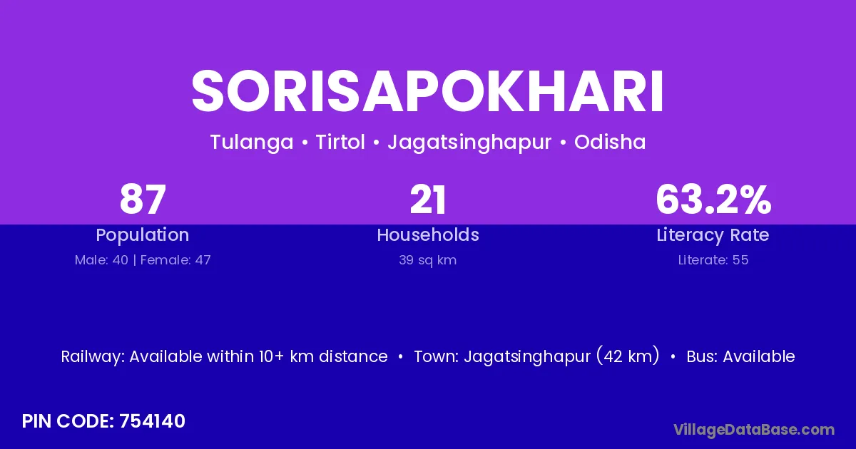 Jagatsinghapur (42 km) is the nearest town to Sorisapokhari village for major economic activities and is located approximately 42 km away.