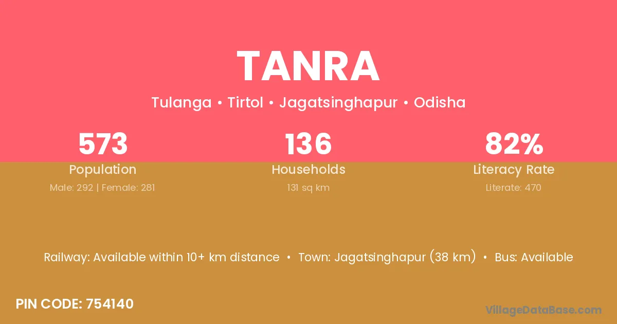 Jagatsinghapur (38 km) is the nearest town to Tanra village for major economic activities and is located approximately 38 km away.