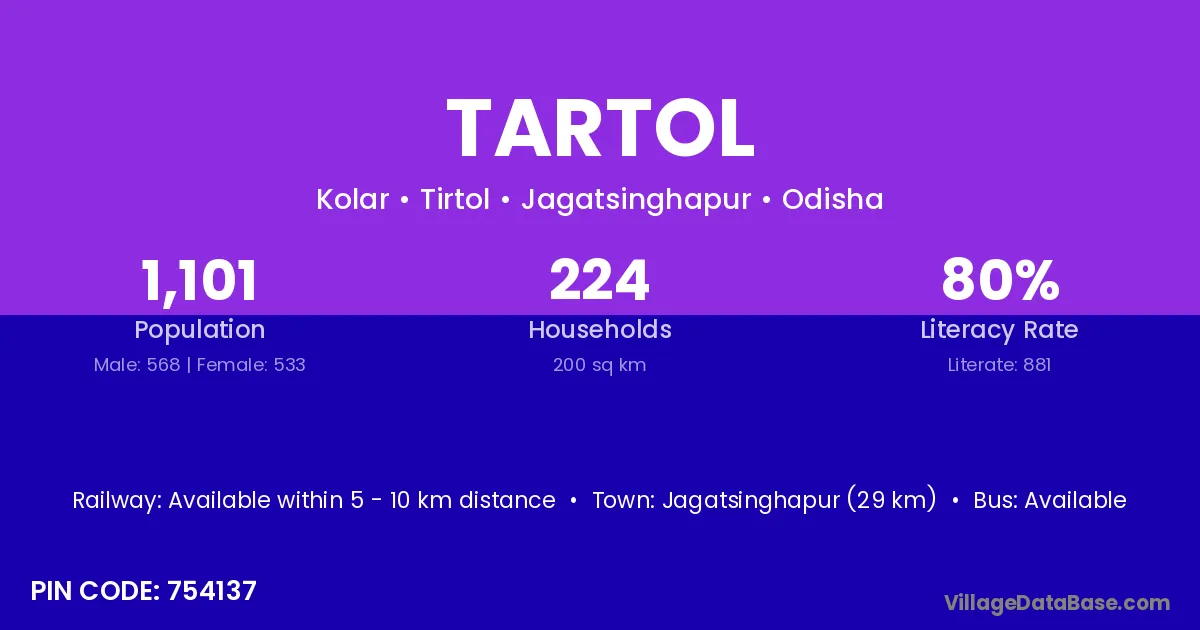 Jagatsinghapur (29 km) is the nearest town to Tartol village for major economic activities and is located approximately 29 km away.