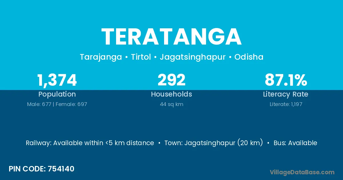 Jagatsinghapur (20 km) is the nearest town to Teratanga village for major economic activities and is located approximately 20 km away.