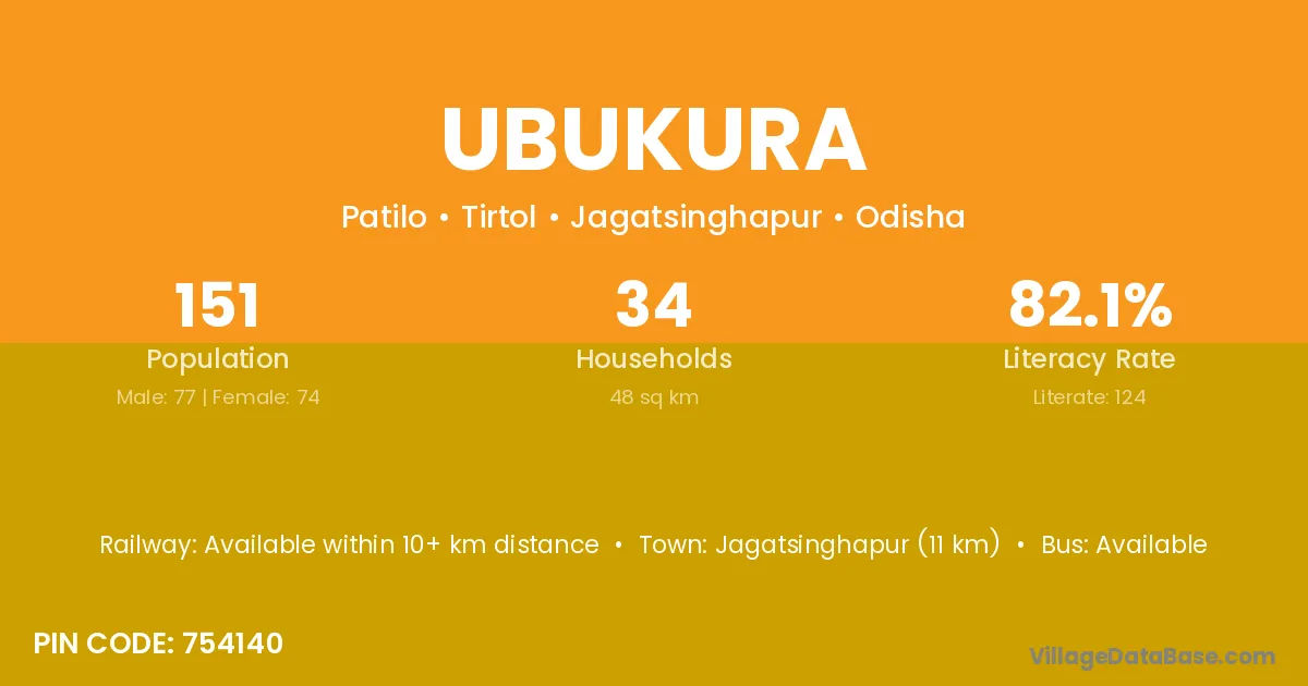 Jagatsinghapur (11 km) is the nearest town to Ubukura village for major economic activities and is located approximately 11 km away.
