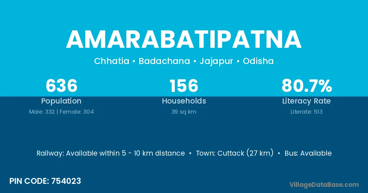 Cuttack (27 km) is the nearest town to Amarabatipatna village for major economic activities and is located approximately 27 km away.