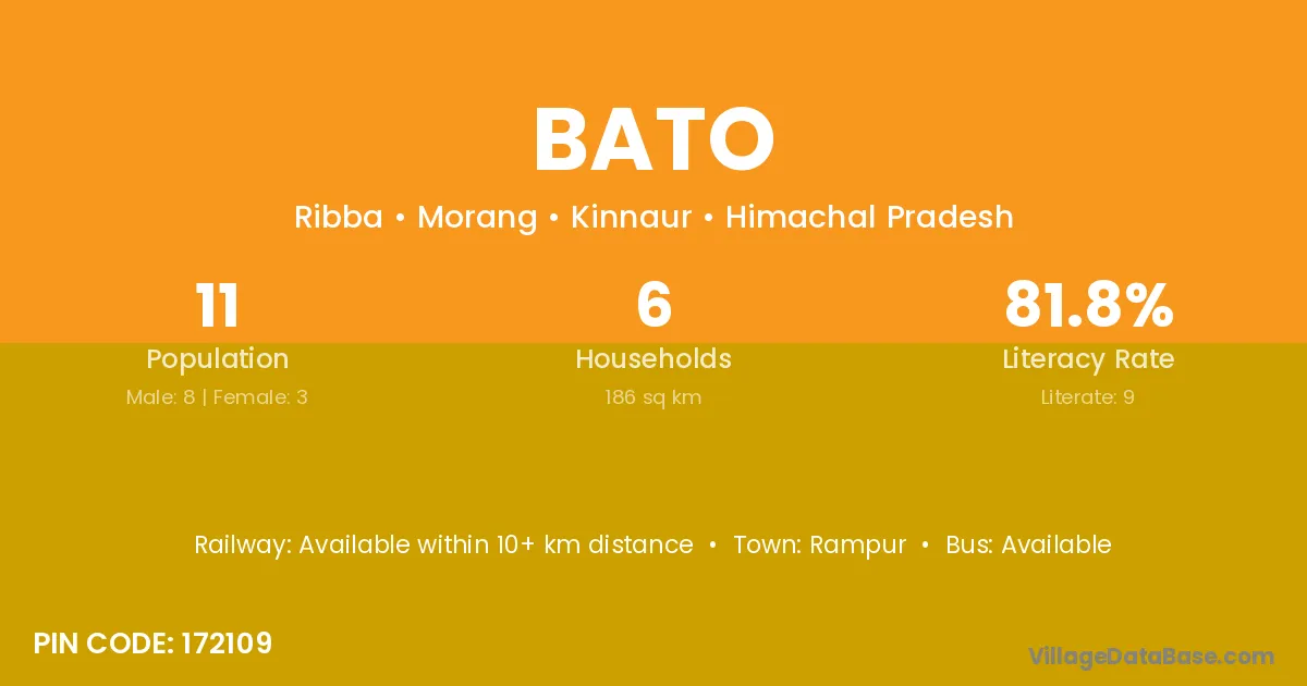Bato village has a total population of 1,169 people, of which 594 are males and 575 are females.