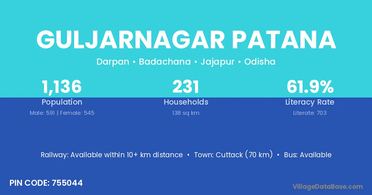 Cuttack (70 km) is the nearest town to Guljarnagar Patana village for major economic activities and is located approximately 70 km away.