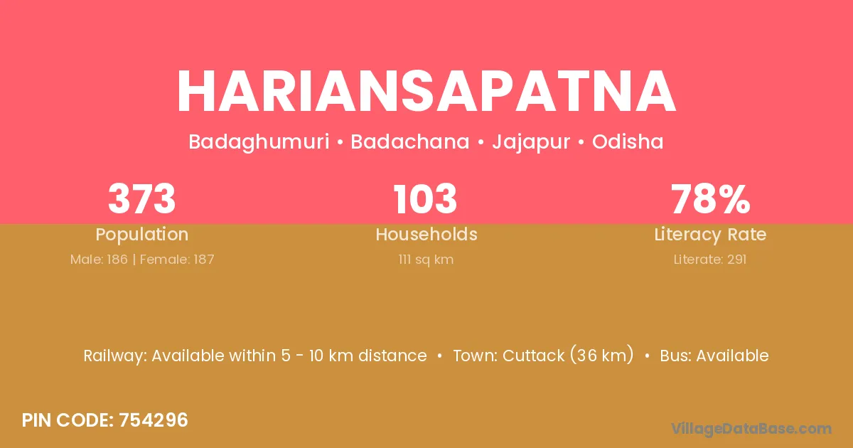 Cuttack (36 km) is the nearest town to Hariansapatna village for major economic activities and is located approximately 36 km away.