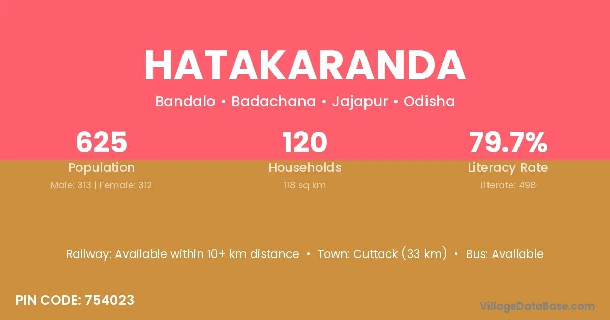 Cuttack (33 km) is the nearest town to Hatakaranda village for major economic activities and is located approximately 33 km away.