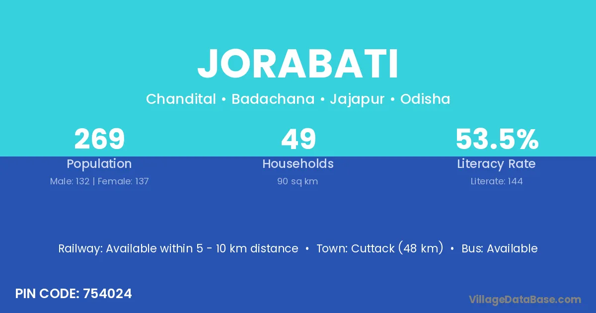 Cuttack (48 km) is the nearest town to Jorabati village for major economic activities and is located approximately 48 km away.