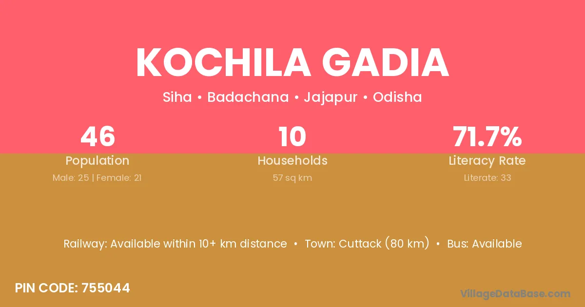 Cuttack (80 km) is the nearest town to Kochila Gadia village for major economic activities and is located approximately 80 km away.