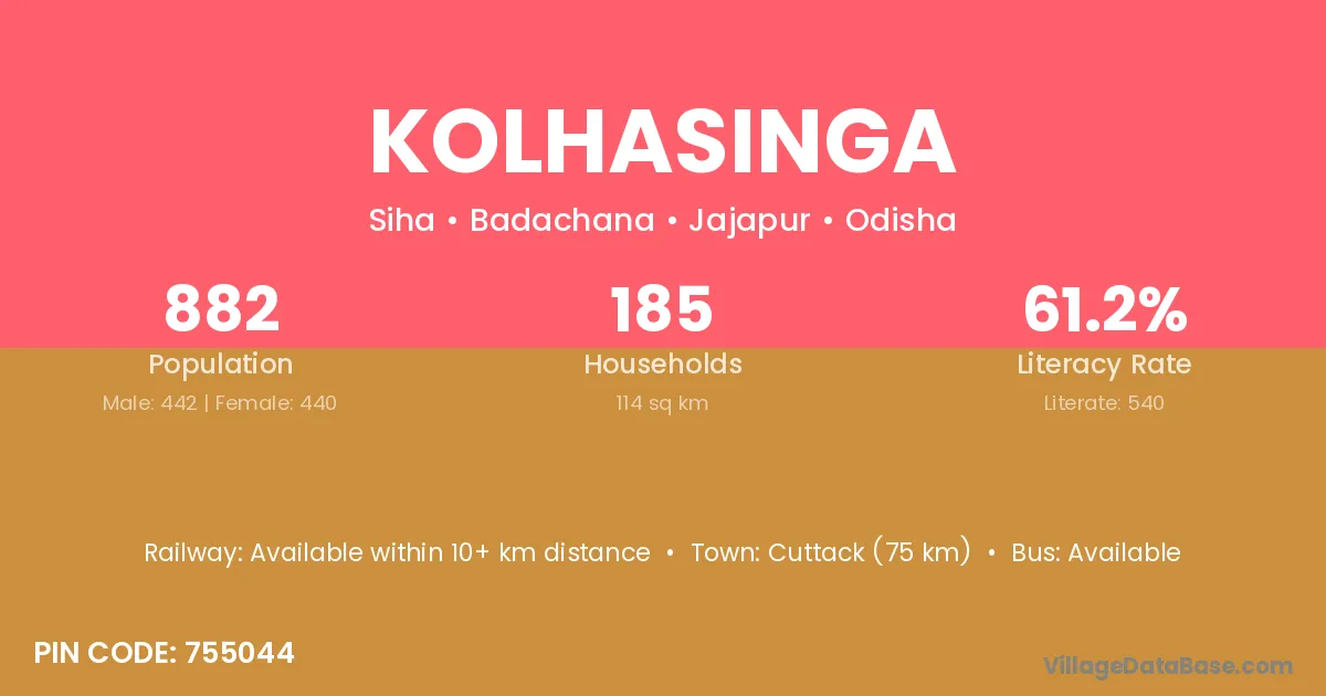 Cuttack (75 km) is the nearest town to Kolhasinga village for major economic activities and is located approximately 75 km away.