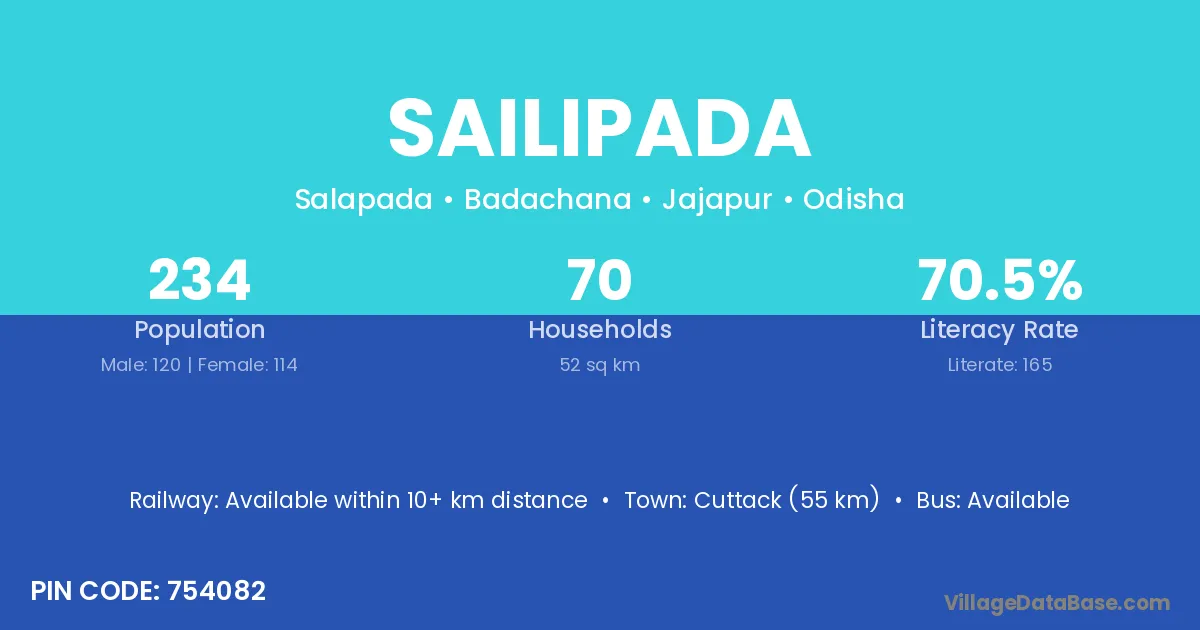 Cuttack (55 km) is the nearest town to Sailipada village for major economic activities and is located approximately 55 km away.