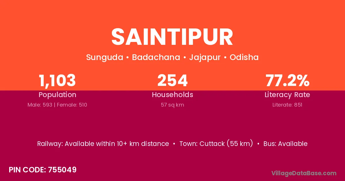 Saintipur village has a total population of 1,103 people, of which 593 are males and 510 are females.