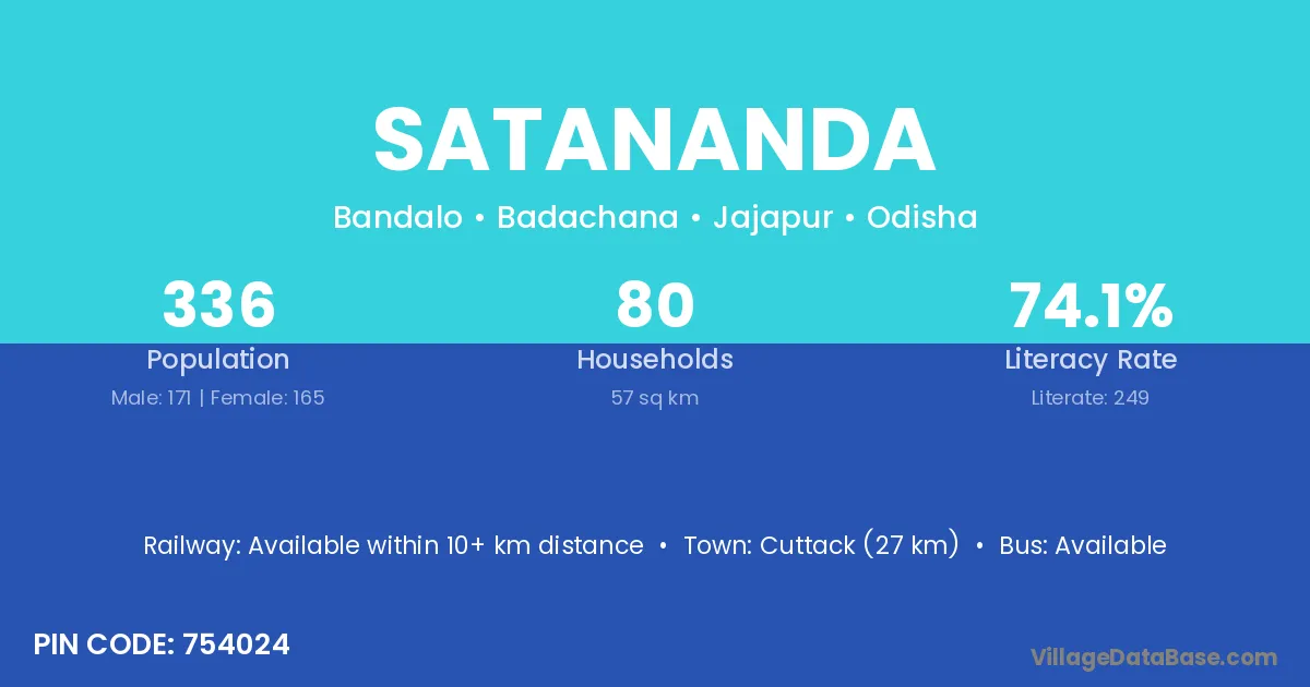 Cuttack (27 km) is the nearest town to Satananda village for major economic activities and is located approximately 27 km away.