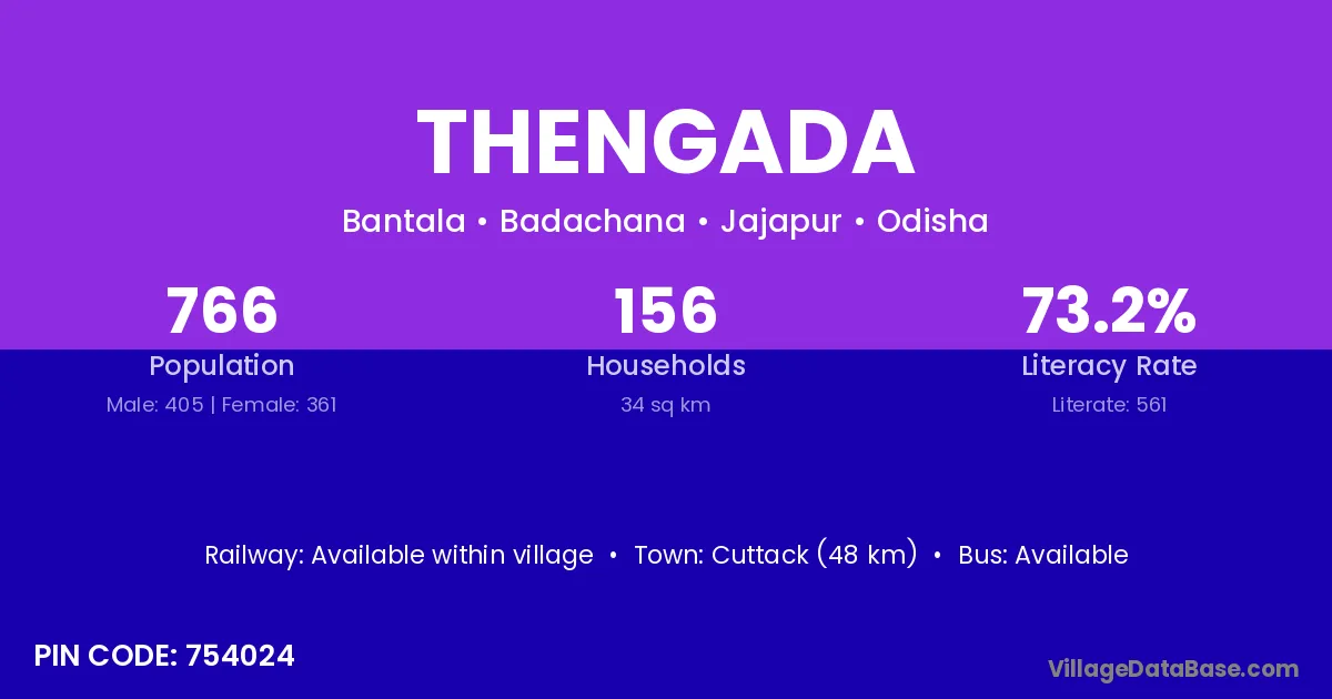Cuttack (48 km) is the nearest town to Thengada village for major economic activities and is located approximately 48 km away.