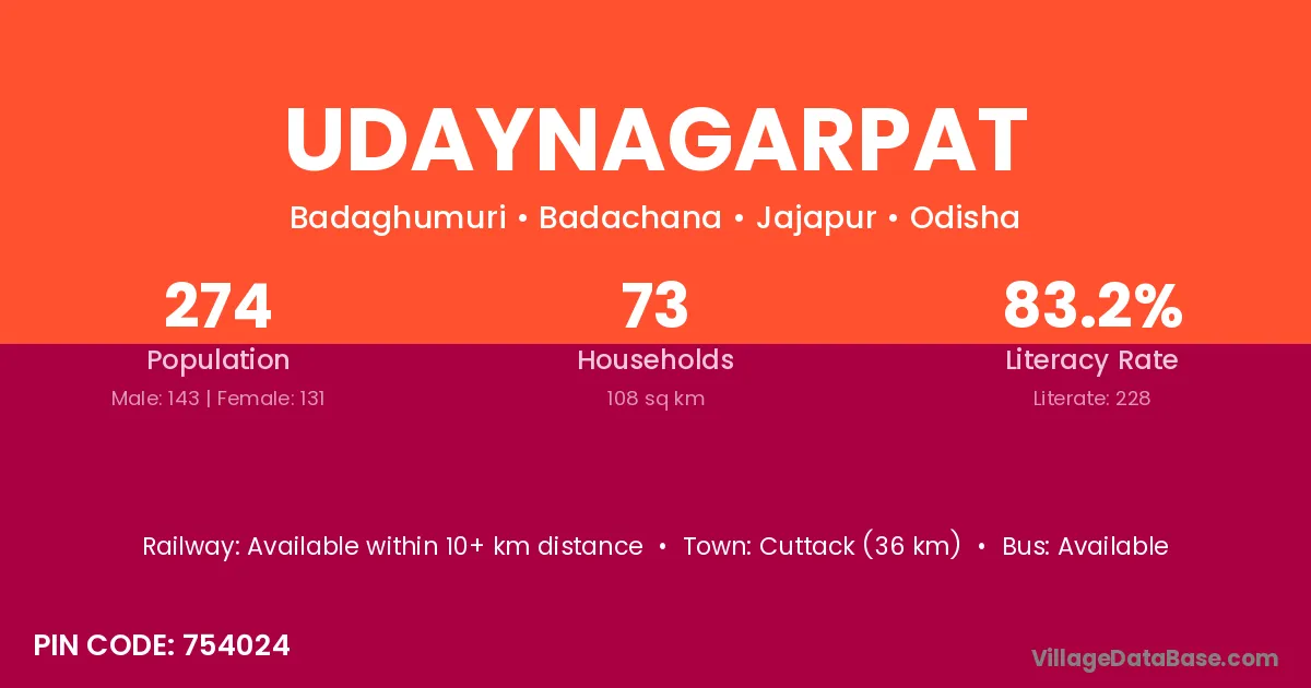 Cuttack (36 km) is the nearest town to Udaynagarpat village for major economic activities and is located approximately 36 km away.