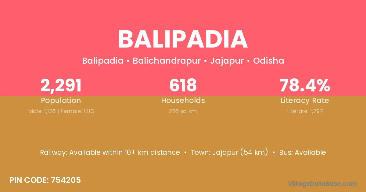 Jajapur (54 km) is the nearest town to Balipadia village for major economic activities and is located approximately 54 km away.