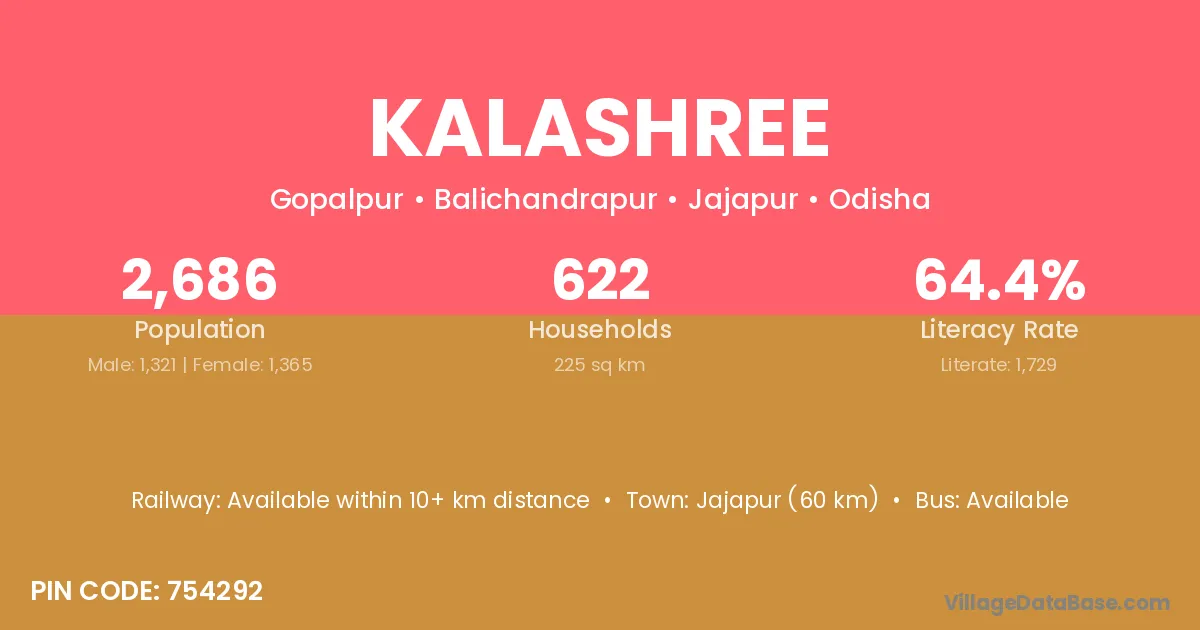 Kalashree village has a total population of 2,686 people, of which 1,321 are males and 1,365 are females.