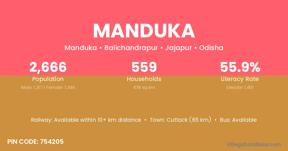 Cuttack (65 km) is the nearest town to Manduka village for major economic activities and is located approximately 65 km away.