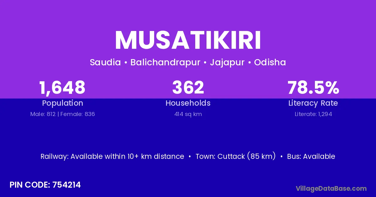 Cuttack (85 km) is the nearest town to Musatikiri village for major economic activities and is located approximately 85 km away.