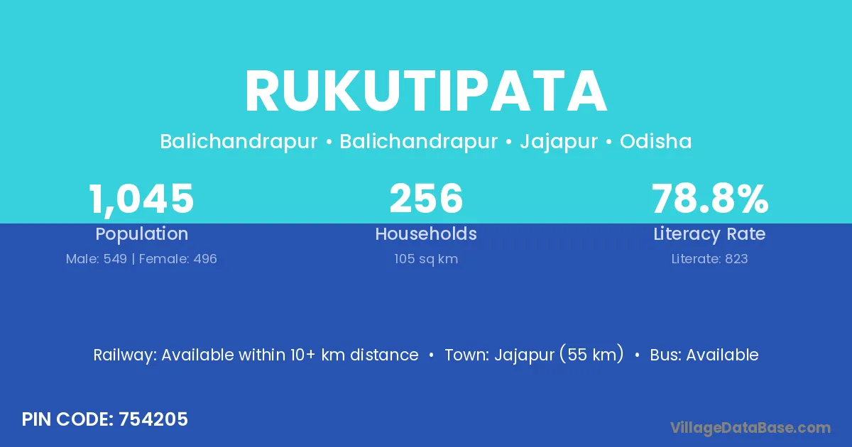 Jajapur (55 km) is the nearest town to Rukutipata village for major economic activities and is located approximately 55 km away.