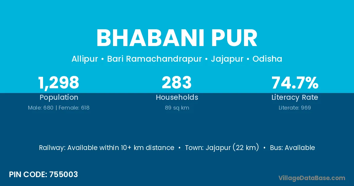 Jajapur (22 km) is the nearest town to Bhabani Pur village for major economic activities and is located approximately 22 km away.
