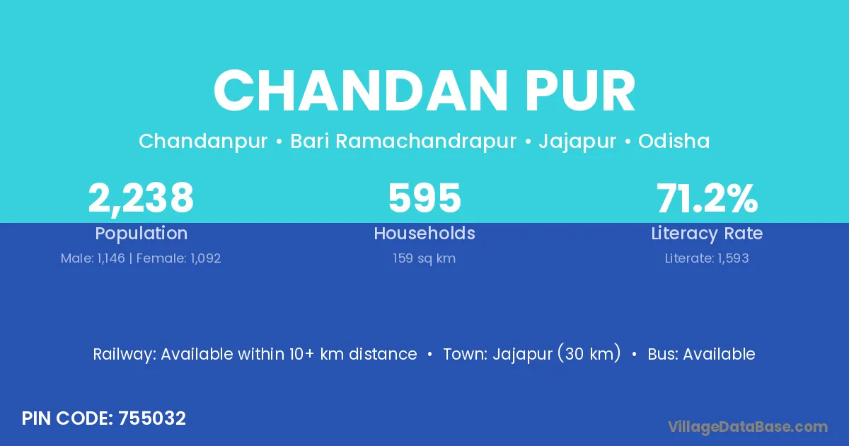 Jajapur (30 km) is the nearest town to Chandan Pur village for major economic activities and is located approximately 30 km away.