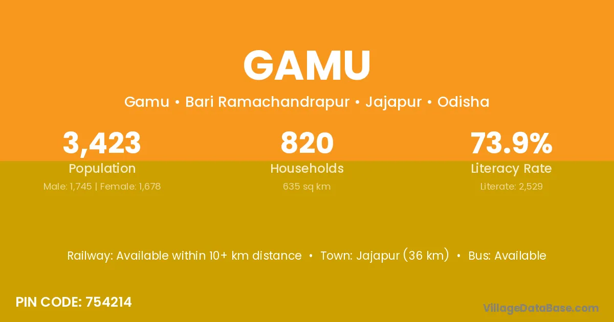 Jajapur (36 km) is the nearest town to Gamu village for major economic activities and is located approximately 36 km away.