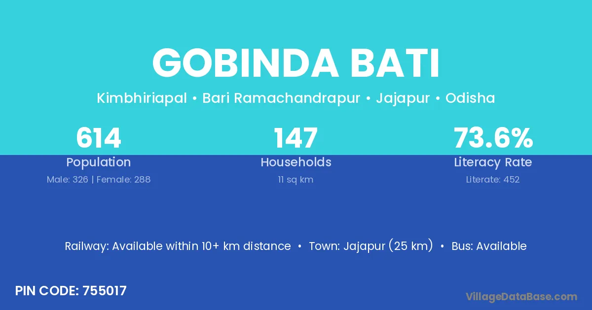 Jajapur (25 km) is the nearest town to Gobinda Bati village for major economic activities and is located approximately 25 km away.