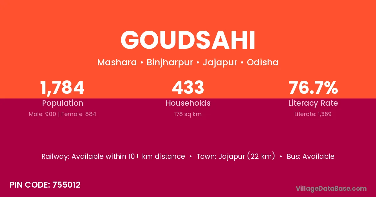 Jajapur (30 km) is the nearest town to Goudsahi village for major economic activities and is located approximately 30 km away.