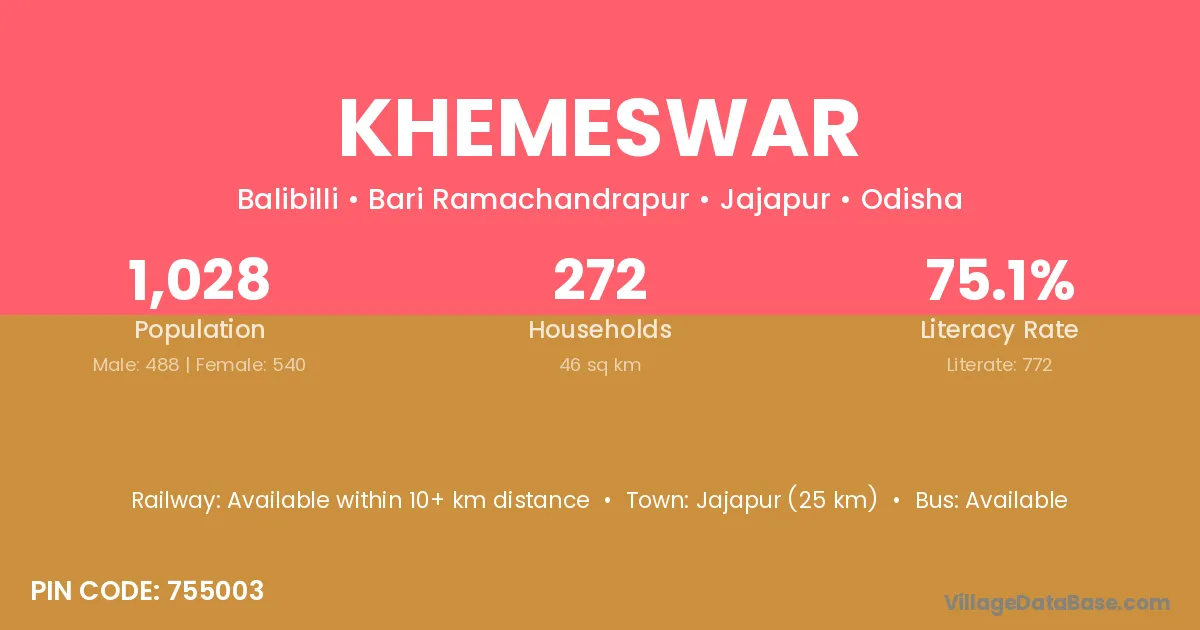 According to Census 2011 information, the village code of Khemeswar village is 755003.