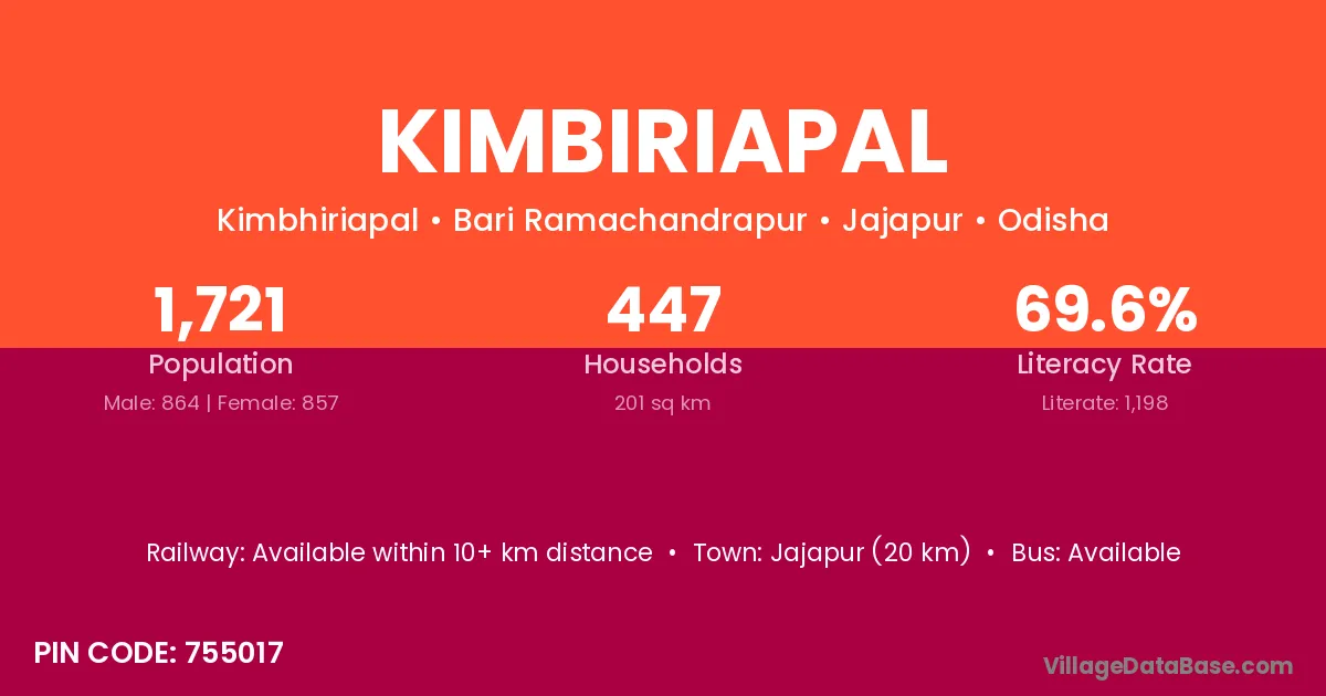 Jajapur (20 km) is the nearest town to Kimbiriapal village for major economic activities and is located approximately 20 km away.