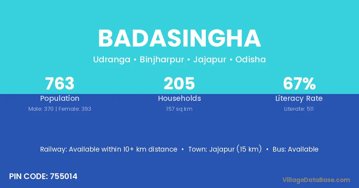 Jajapur (15 km) is the nearest town to Badasingha village for major economic activities and is located approximately 15 km away.