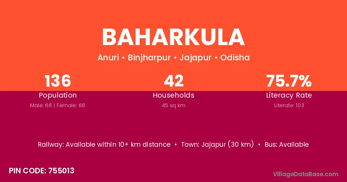 Jajapur (30 km) is the nearest town to Baharkula village for major economic activities and is located approximately 30 km away.