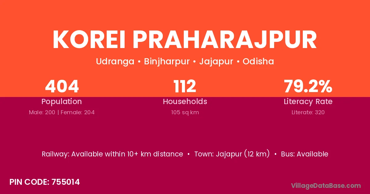 Korei Praharajpur village has a total population of 404 people, of which 200 are males and 204 are females.