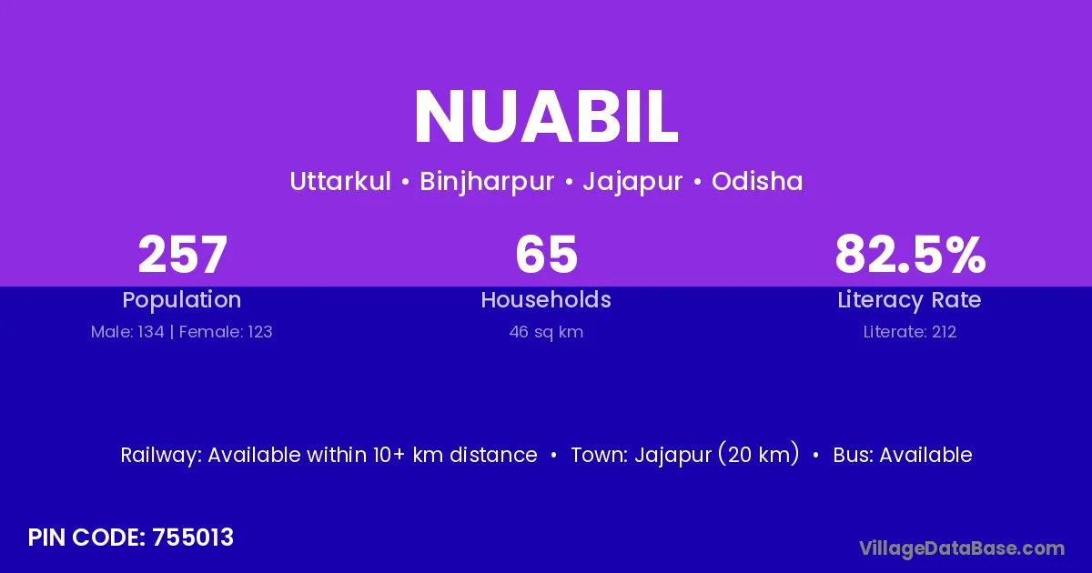 Jajapur (20 km) is the nearest town to Nuabil village for major economic activities and is located approximately 20 km away.