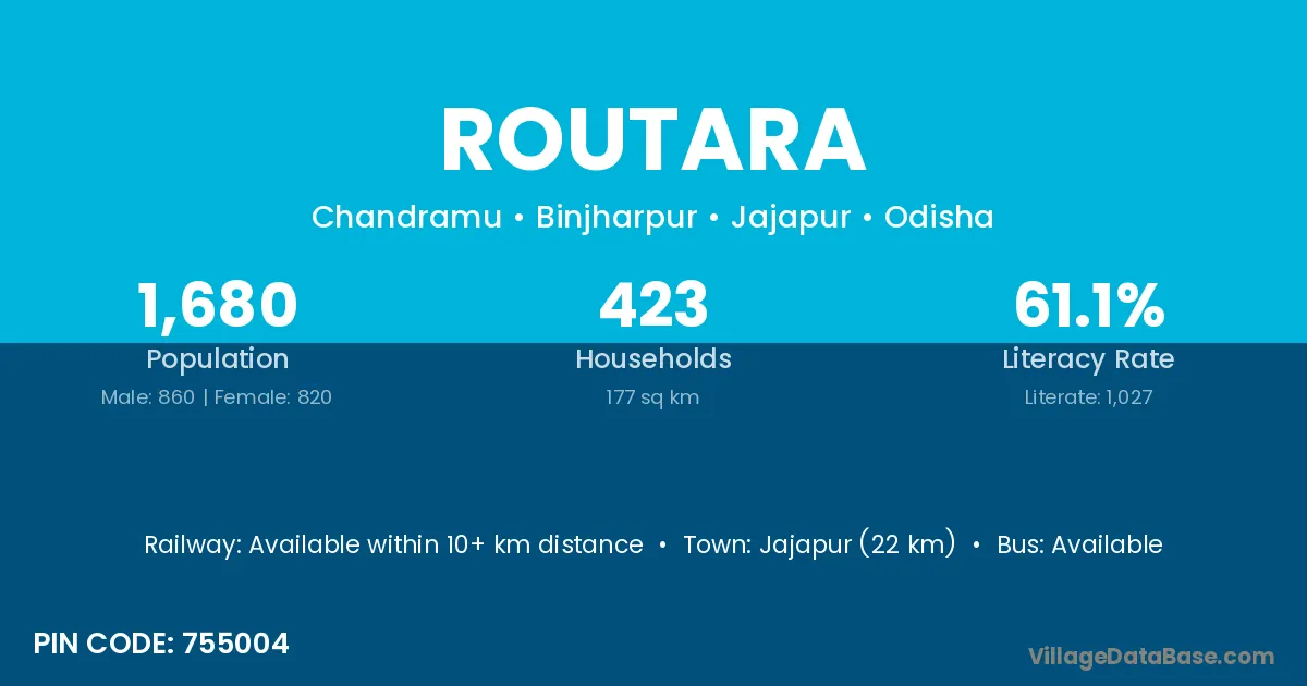 Jajapur (22 km) is the nearest town to Routara village for major economic activities and is located approximately 22 km away.