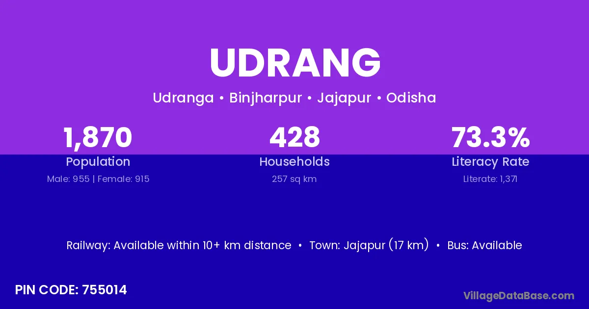 Jajapur (17 km) is the nearest town to Udrang village for major economic activities and is located approximately 17 km away.