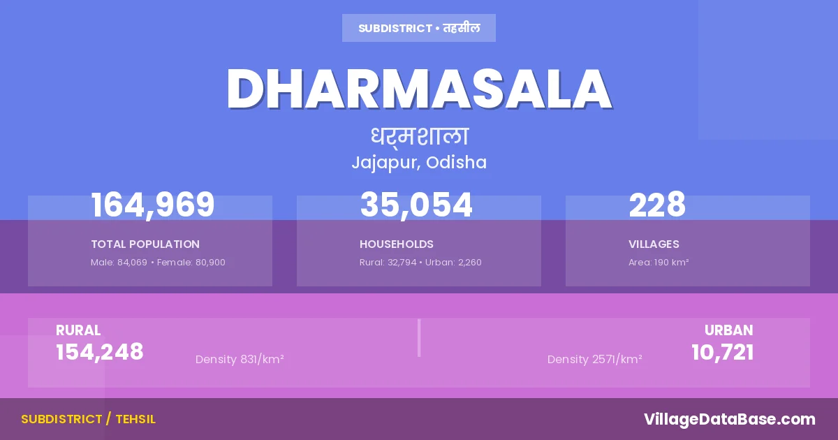 According to the 2011 census The total area of Dharmasala Tehsil is 190 km², with a population of 164969 people. The population density is 869 inhabitants per square kilometre, and there are approximately 35054 houses in the sub district.