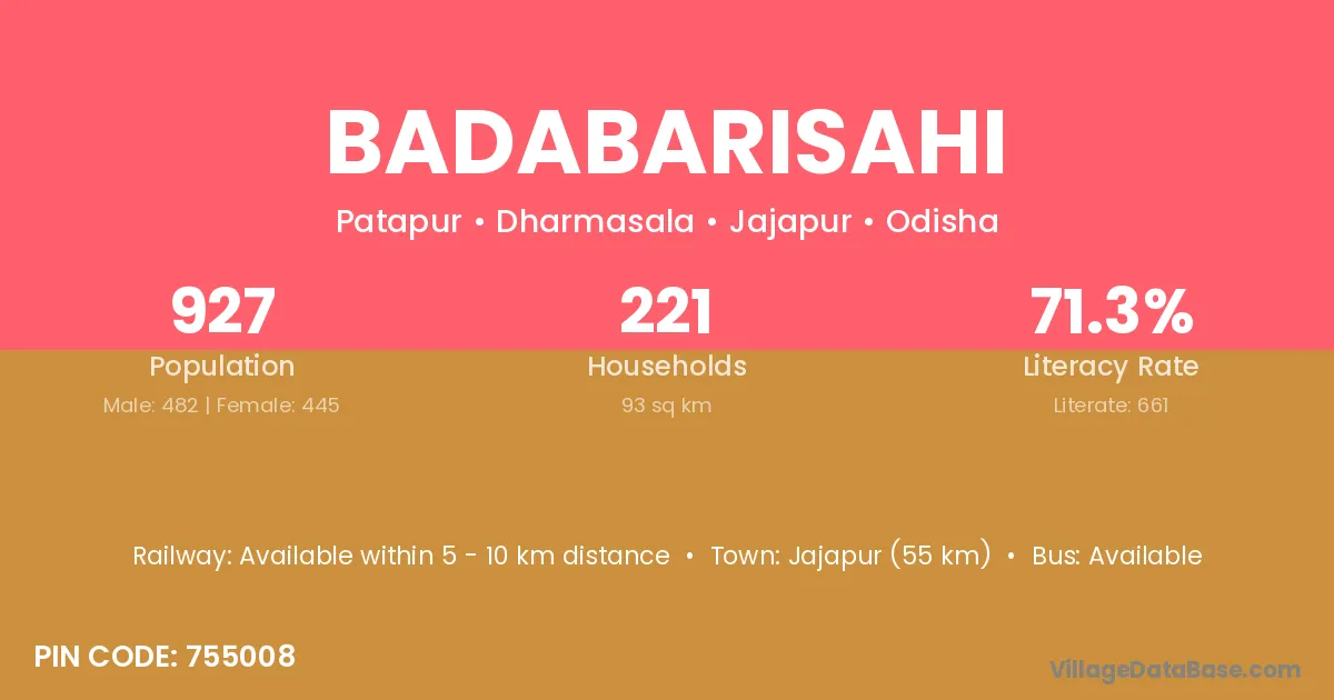 Jajapur (55 km) is the nearest town to Badabarisahi village for major economic activities and is located approximately 55 km away.