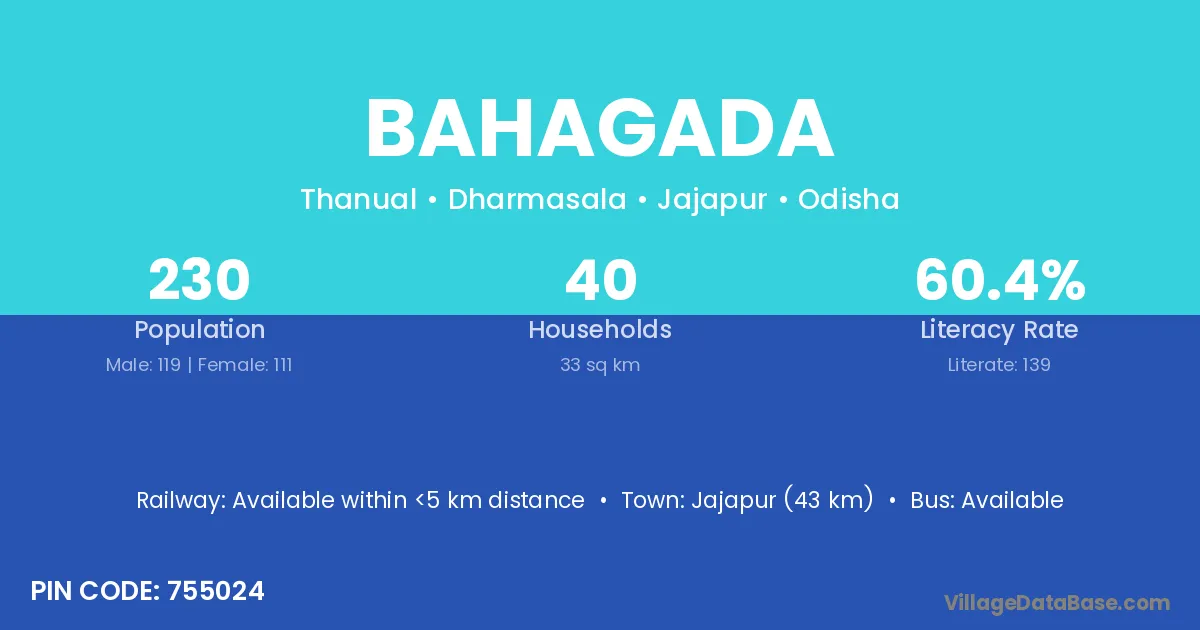 Jajapur (43 km) is the nearest town to Bahagada village for major economic activities and is located approximately 43 km away.