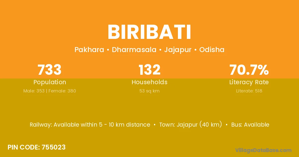Jajapur (40 km) is the nearest town to Biribati village for major economic activities and is located approximately 40 km away.
