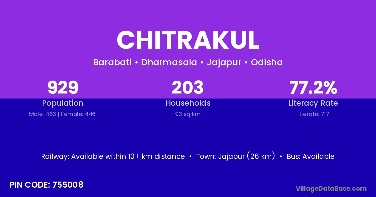 Jajapur (26 km) is the nearest town to Chitrakul village for major economic activities and is located approximately 26 km away.