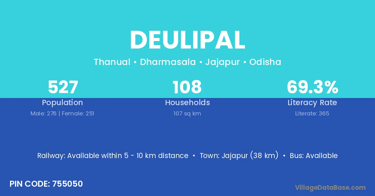 Jajapur (38 km) is the nearest town to Deulipal village for major economic activities and is located approximately 38 km away.