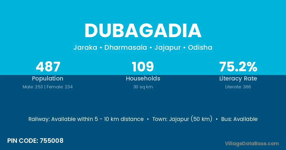 Jajapur (50 km) is the nearest town to Dubagadia village for major economic activities and is located approximately 50 km away.