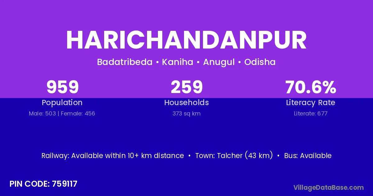 Jajapur (60 km) is the nearest town to Harichandanpur village for major economic activities and is located approximately 60 km away.