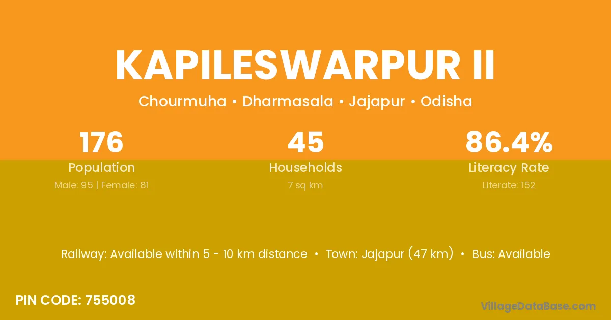 Kapileswarpur Ii village has a total population of 176 people, of which 95 are males and 81 are females.